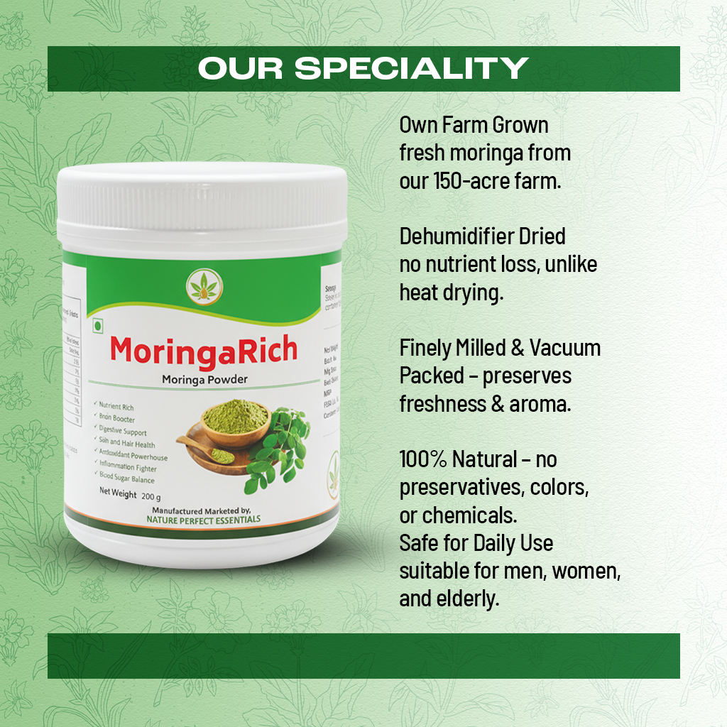 Our Moringa Powder is made from tender moringa (drumstick) leaves grown on our own farms. The leaves
